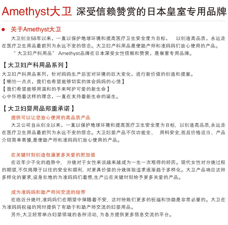 大衛(wèi)公司自從創(chuàng)業(yè)以來,一直以保護地球環(huán)境和提高醫(yī)療衛(wèi)生安全度為目標,以創(chuàng)造高品質,永遠走在醫(yī)療衛(wèi)生用品最前列為永遠不變的信念。大衛(wèi)婦嬰產品不僅功能全、用料安全,而且價格適當、產品介紹簡單易懂,是使助產師和準媽媽們放心使用的產品。