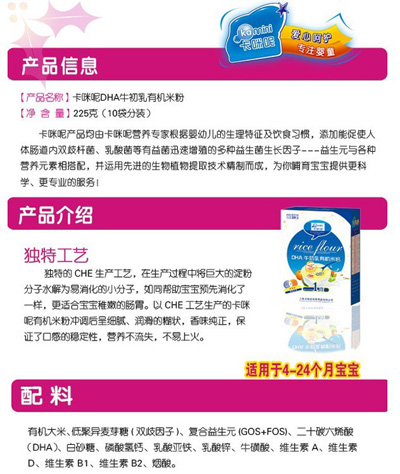 卡咪呢乳清蛋白嬰幼兒營養(yǎng)米粉是上海卡咪呢母嬰用品有限公司旗下產(chǎn)品,精選優(yōu)質(zhì)大米制作,特別添加乳清蛋白和益生元,提高寶寶抵抗力,促進(jìn)寶寶changdao的消化吸收,上市以來廣受父母消費(fèi)者的青睞。