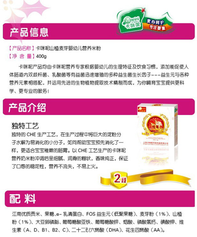 卡咪呢乳清蛋白嬰幼兒營(yíng)養(yǎng)米粉是上?ㄟ淠啬笅胗闷酚邢薰酒煜庐a(chǎn)品,精選優(yōu)質(zhì)大米制作,特別添加乳清蛋白和益生元,提高寶寶抵抗力,促進(jìn)寶寶changdao的消化吸收,上市以來(lái)廣受父母消費(fèi)者的青睞。