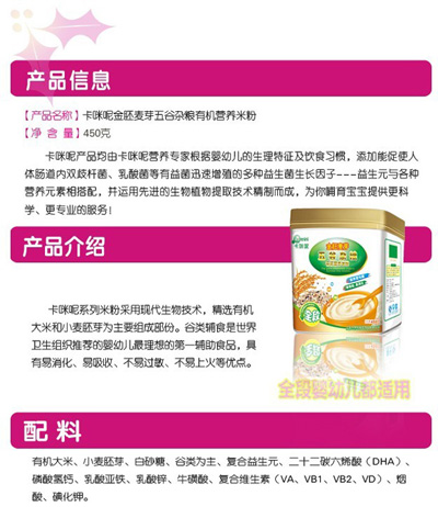 卡咪呢有機米粉系列是專為中國寶寶設(shè)計的營養(yǎng)輔食,選用有機大米,科學(xué)搭配維生素AD等維生素,還特別添加;撬、DHA、AA等有助智力發(fā)育的營養(yǎng)成分,富含15種營養(yǎng)素,F(xiàn)上?ㄟ淠啬笅胗闷酚邢薰久嫦蛉珖瞻资袌鰠^(qū)域誠招卡咪呢有機米粉代理商。