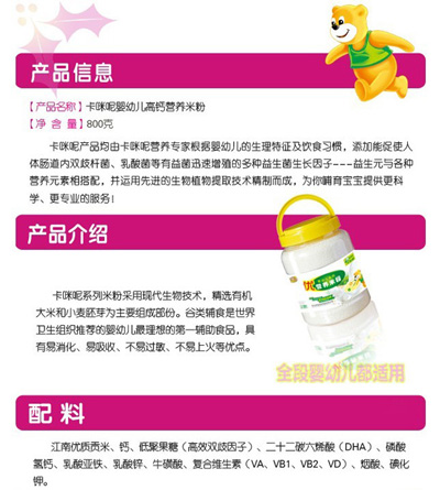 卡咪呢有機(jī)米粉系列是專為中國(guó)寶寶設(shè)計(jì)的營(yíng)養(yǎng)輔食,選用有機(jī)大米,科學(xué)搭配維生素AD等維生素,還特別添加;撬帷HA、AA等有助智力發(fā)育的營(yíng)養(yǎng)成分,富含15種營(yíng)養(yǎng)素。現(xiàn)上?ㄟ淠啬笅胗闷酚邢薰久嫦蛉珖(guó)空白市場(chǎng)區(qū)域誠(chéng)招卡咪呢有機(jī)米粉代理商。