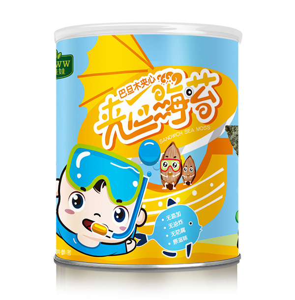 好娃娃夾心海苔系列有桶裝、袋裝兩個包裝,采用的是進口無污染,自然生成且生長周期合適的條斑紫菜
