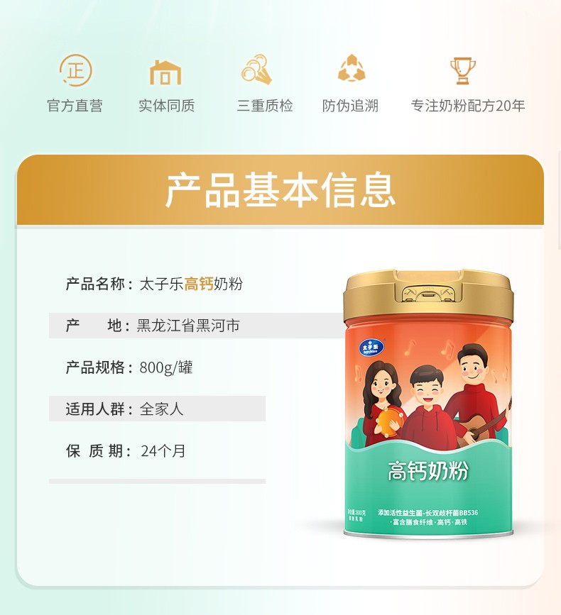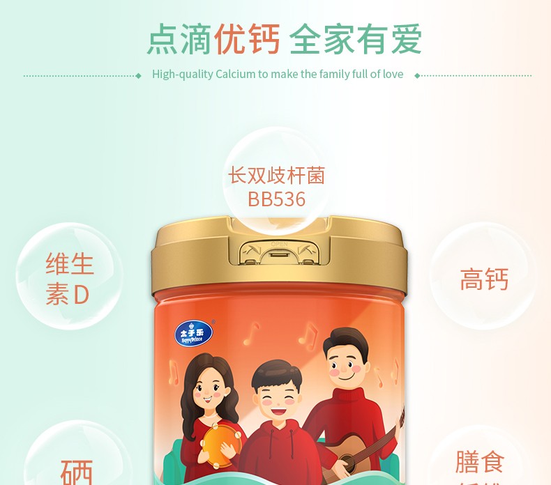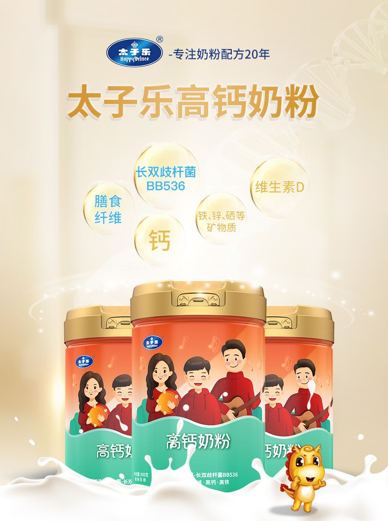 太子樂高鈣奶粉定制日常膳食中缺乏的各種營(yíng)養(yǎng)元素,長(zhǎng)雙歧桿菌BB536、鈣、硒、膳食纖維等,科學(xué)配比鈣含量,滿足全家營(yíng)養(yǎng)所需。