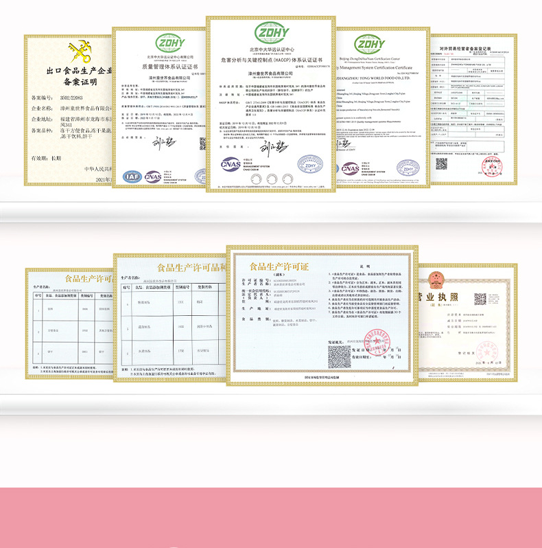 漳州童世界食品有限公司主營一站式代加工OEM業(yè)務,致力于健康兒童食品、功能性代餐食品、凍干燕窩的研發(fā)與生產,公司占地面積12000平方米,始終秉承已科技為先導、以先進的現(xiàn)代化管理依托、已“顧客滿意第一”為宗旨的經營方針、致力發(fā)展成為一家研發(fā)和制造健康、美味、營養(yǎng)的食品企業(yè)。 公司的誠信、實力和產品質量獲得業(yè)界的認可。歡迎各界朋友蒞臨參觀、指導和業(yè)務洽談。