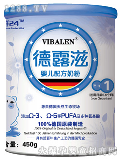 德露滋為德國(guó)制造的奶粉,在德國(guó)同步銷售的商標(biāo)為VIBALEN,盒裝。在亞洲華語(yǔ)地區(qū)為VIBALEN德露滋,聽裝。